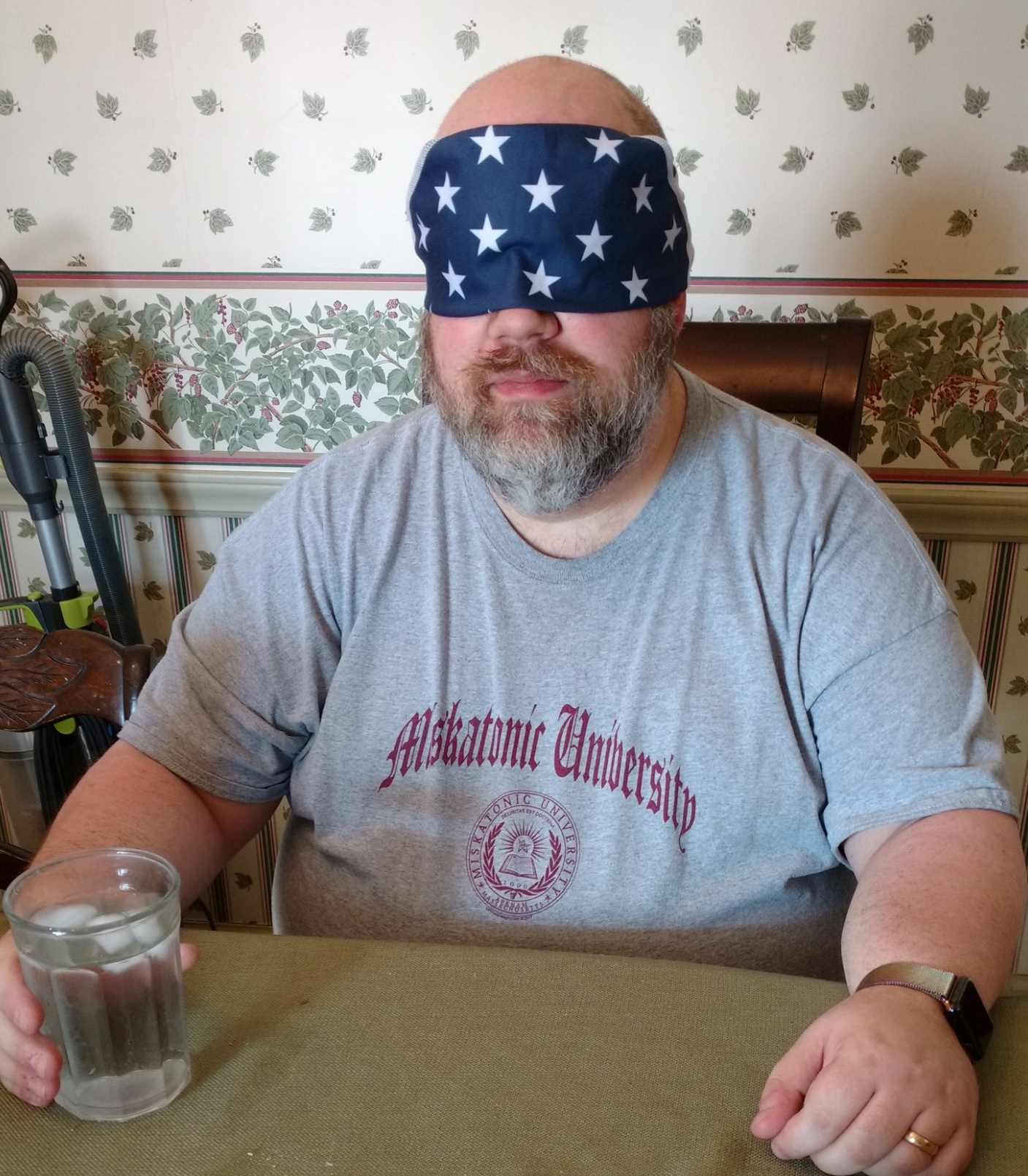 That bandanna wrapped around my eyes is supposedly a Cooling Bandanna, and it’s not only thick cloth to begin with but it’s four layers thick the way I have it folded. I assure you that I couldn’t see a damn thing other than a tiny bit of light coming from the vague direction of my right nostril, which at no point was especially useful. I was fed with a spoon with the exception of the last two items.