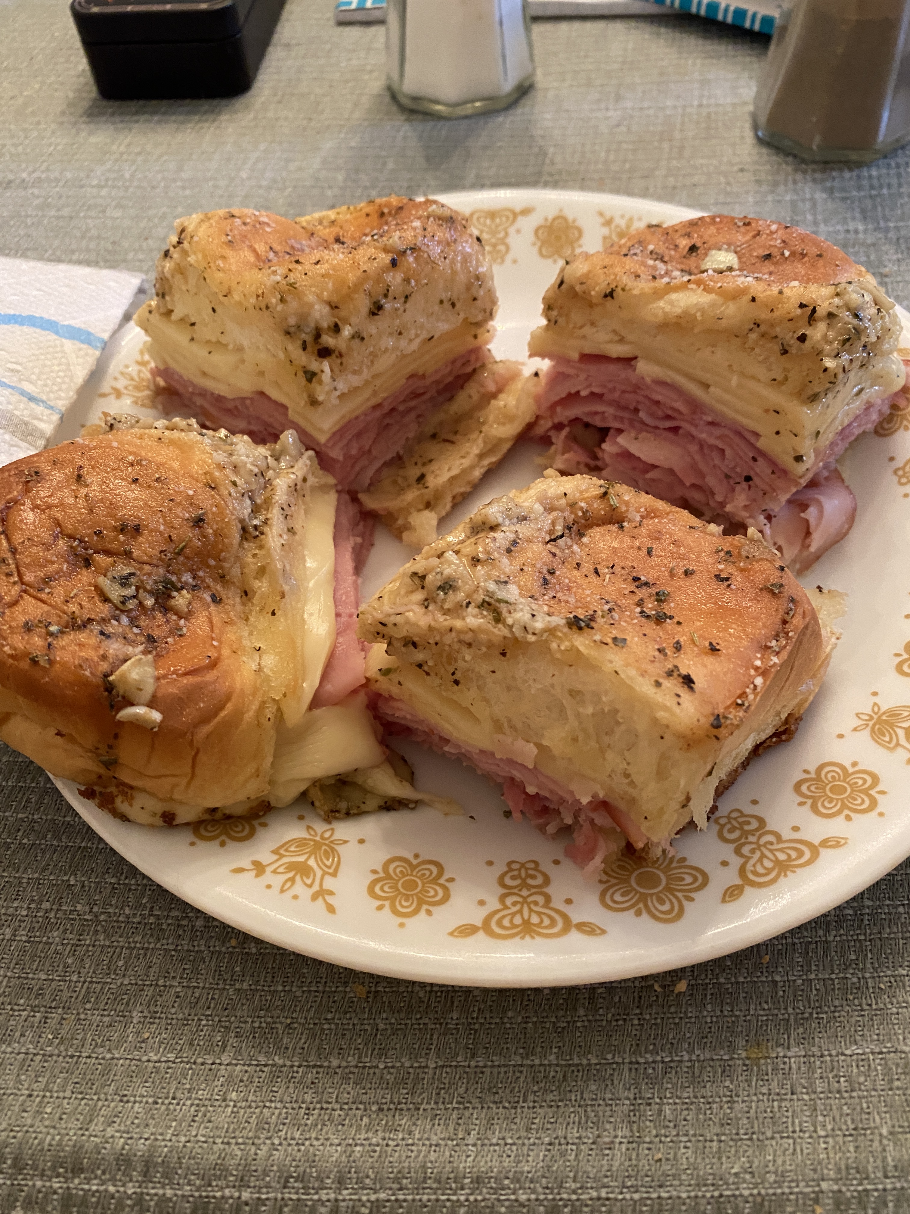 I used a full pound of honey ham; that was probably a bit too much, insofar as “too much ham” can actually be a thing, and I think you could get away with 3/4 of a pound or so. Fold the slices over and arrange them evenly over the bottom half of the bread. On top of the bread, add a double layer of Swiss cheese; half a pound was about right for us. Put the top layer of the rolls on top of the bread and cheese and evenly distribute the rest of the butter-garlic mixture over the tops of the rolls. Cover the whole shebang with foil and bake at 350 degrees for 15 minutes; after 15 minutes remove the foil and continue baking for five additional minutes.