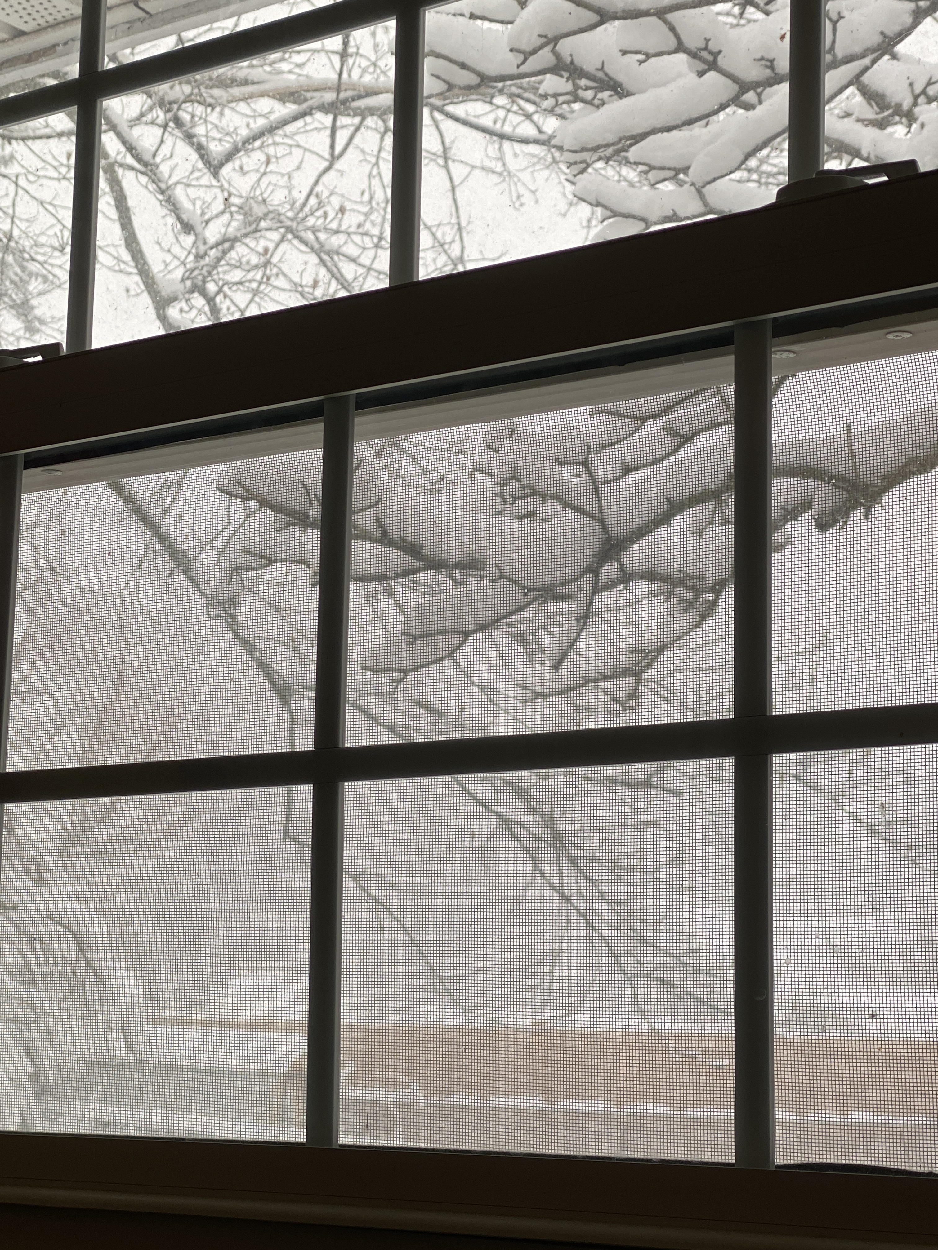 We ended up with a two-hour delay this morning, which didn’t get me any extra sleep but did mean I could sit in my comfy chair and drink a leisurely cup of coffee before leaving for work, and then buy a second cup of coffee on the way to work. It took about twice as long to get there as usual, but the drive itself wasn’t scary, just slow.