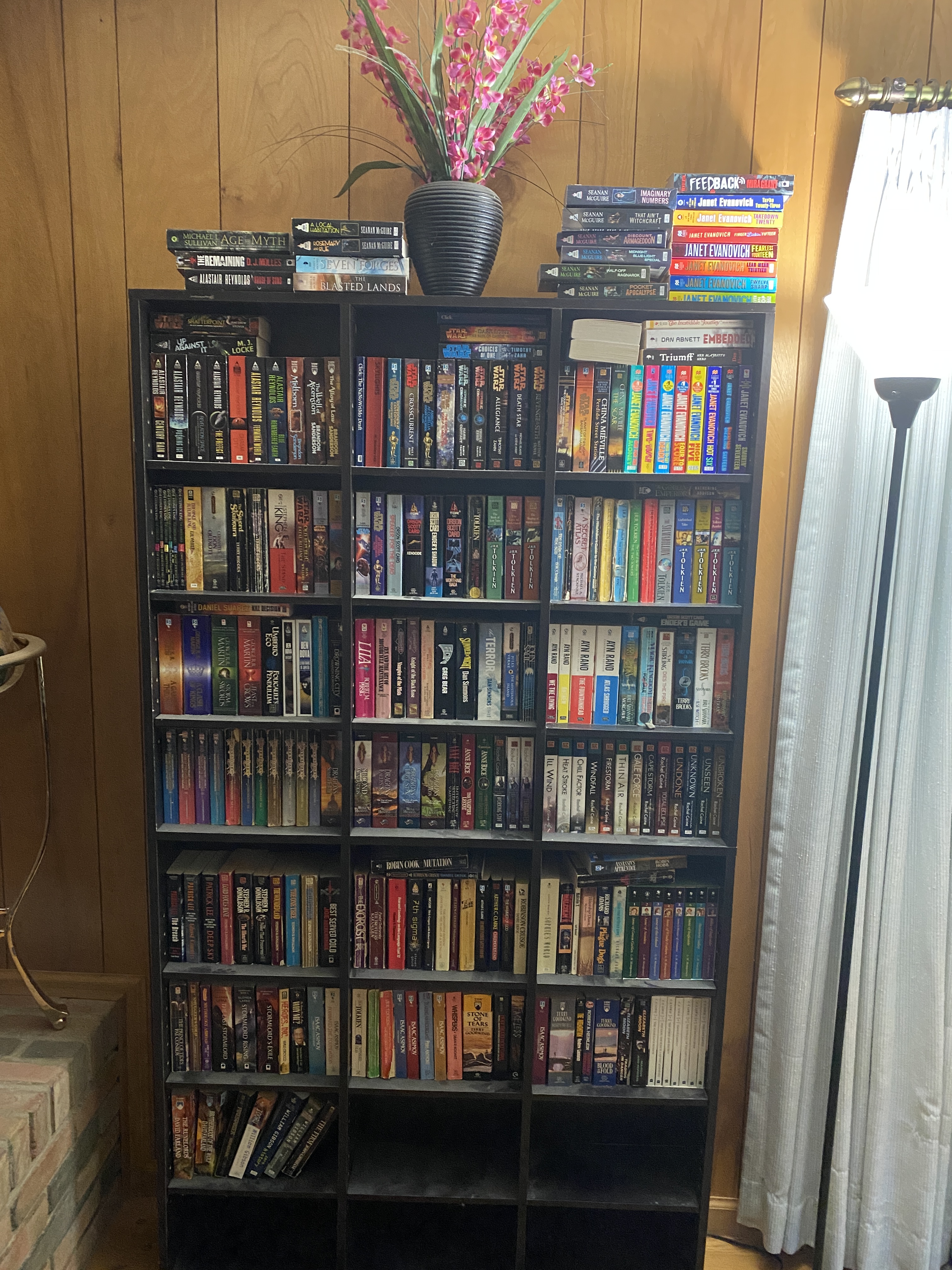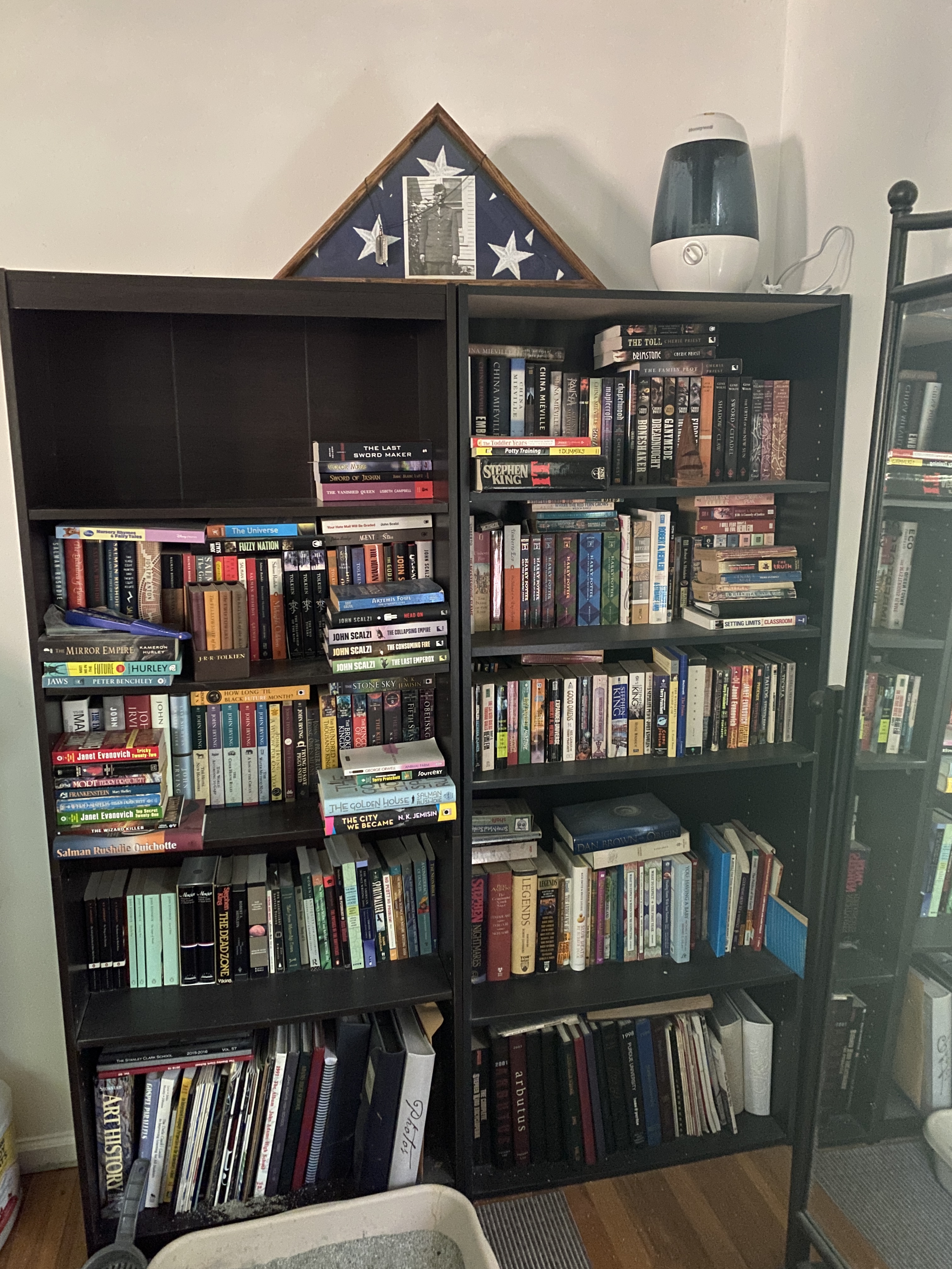 Fiction, a couple of shelves of my wife’s books, and yearbooks and photo albums. Top left is the (empty!!!!) unread shelf; note that the four books on the unread shelf are not part of the unread shelf. Two are ARCs that are due for a review in July sometime and so don’t count yet and two are eventually going to be moved to the People I Know/Indie Authors shelf and I just haven’t gotten around to it for some reason. Also, a litterbox.
