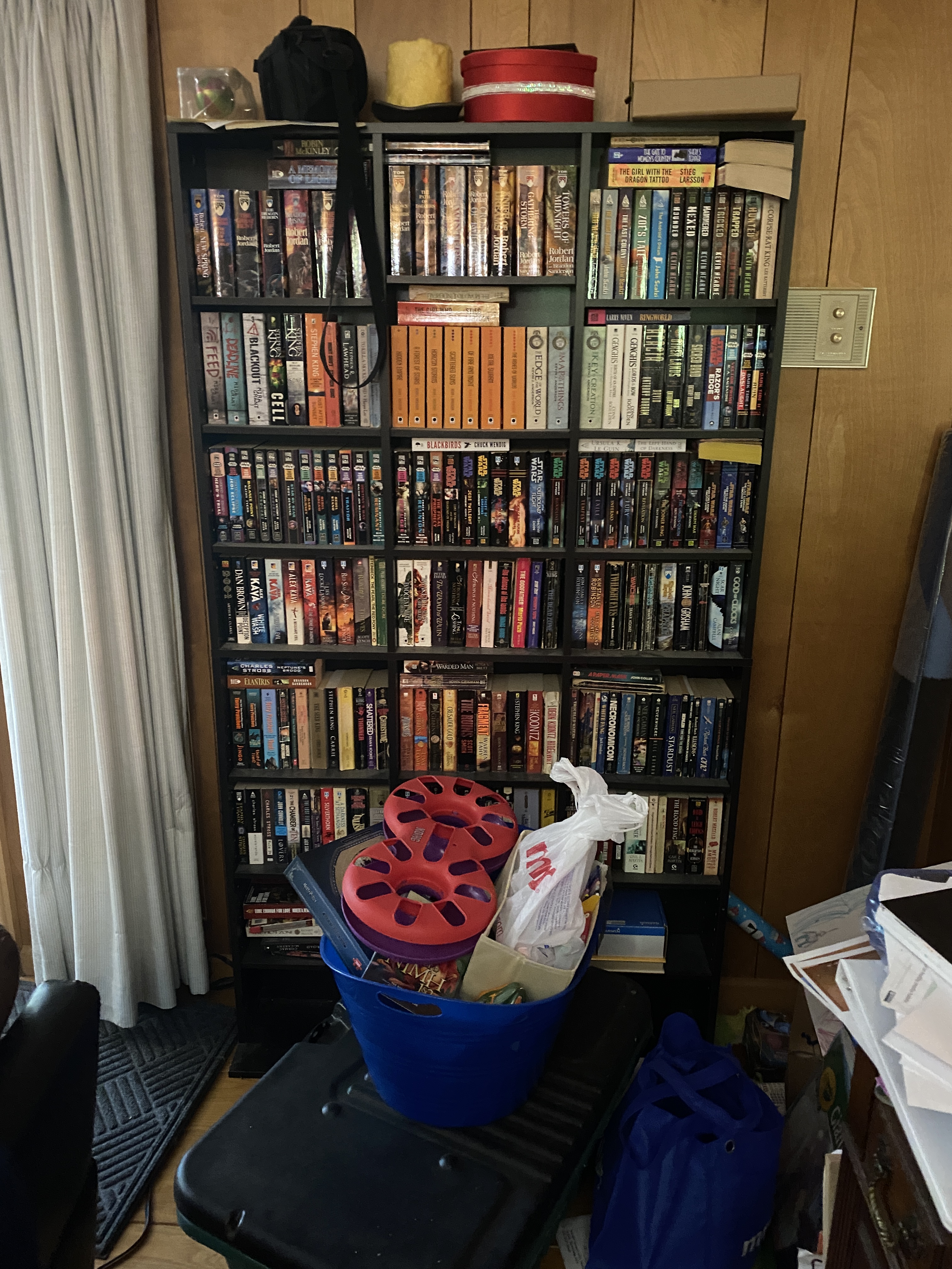 In the office are several boxes full of my own books for whenever I’m able to go to a con again and exactly two shelves, one of hardback Star Wars books and one of generic fiction hardcovers that I didn’t have a better place to put. The shelf itself is in a corner and buried behind a bunch of stuff so I didn’t bother getting a picture of it.