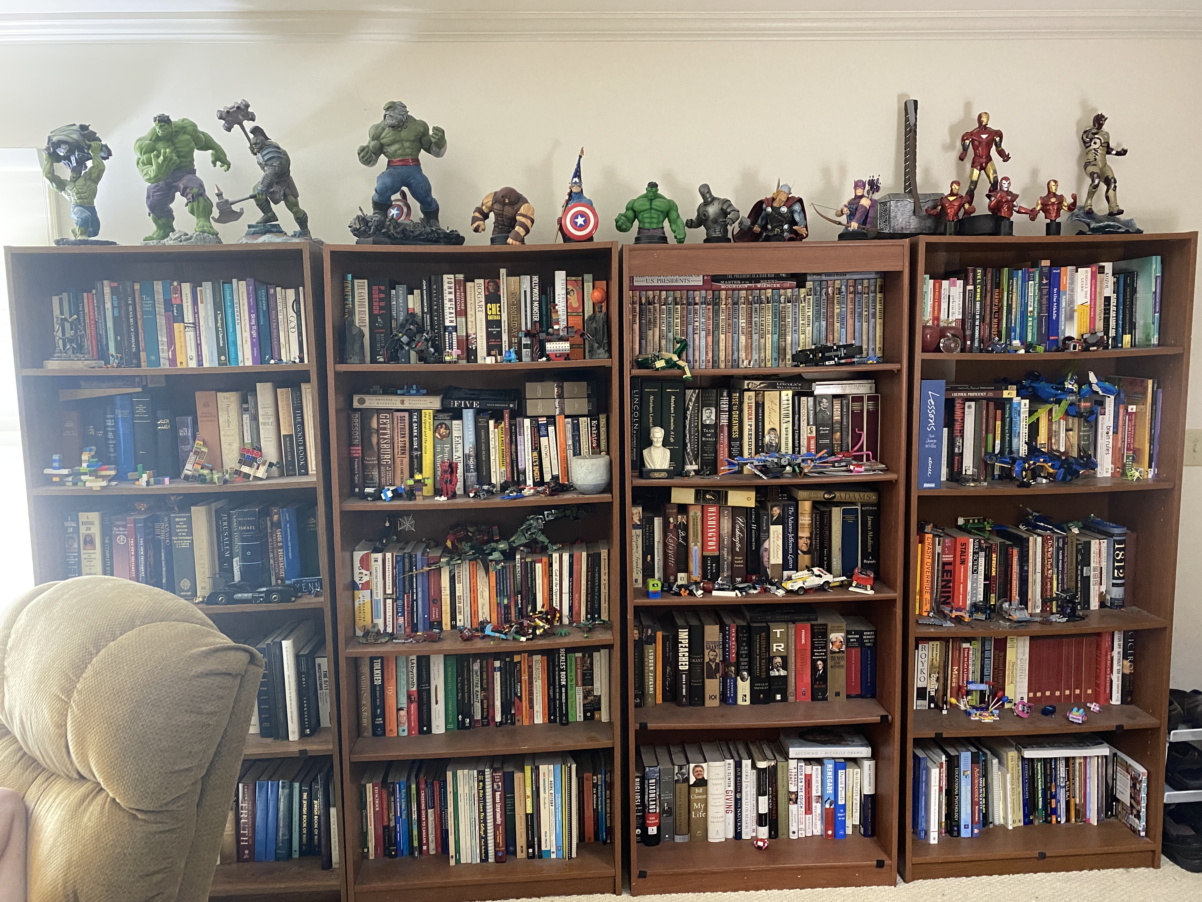 These four bookshelves are on the wall behind the one you just saw, and are part of the reason it’s kind of tricky to get a good shot of that bookshelf. Subjects include religion, presidential history (the third shelf, left to right, the one with Thor and Hawkeye on top, has at least one book by or about every legitimately elected President of the United States, plus my Lincoln shelf,) education, and history and philosophy of science.
