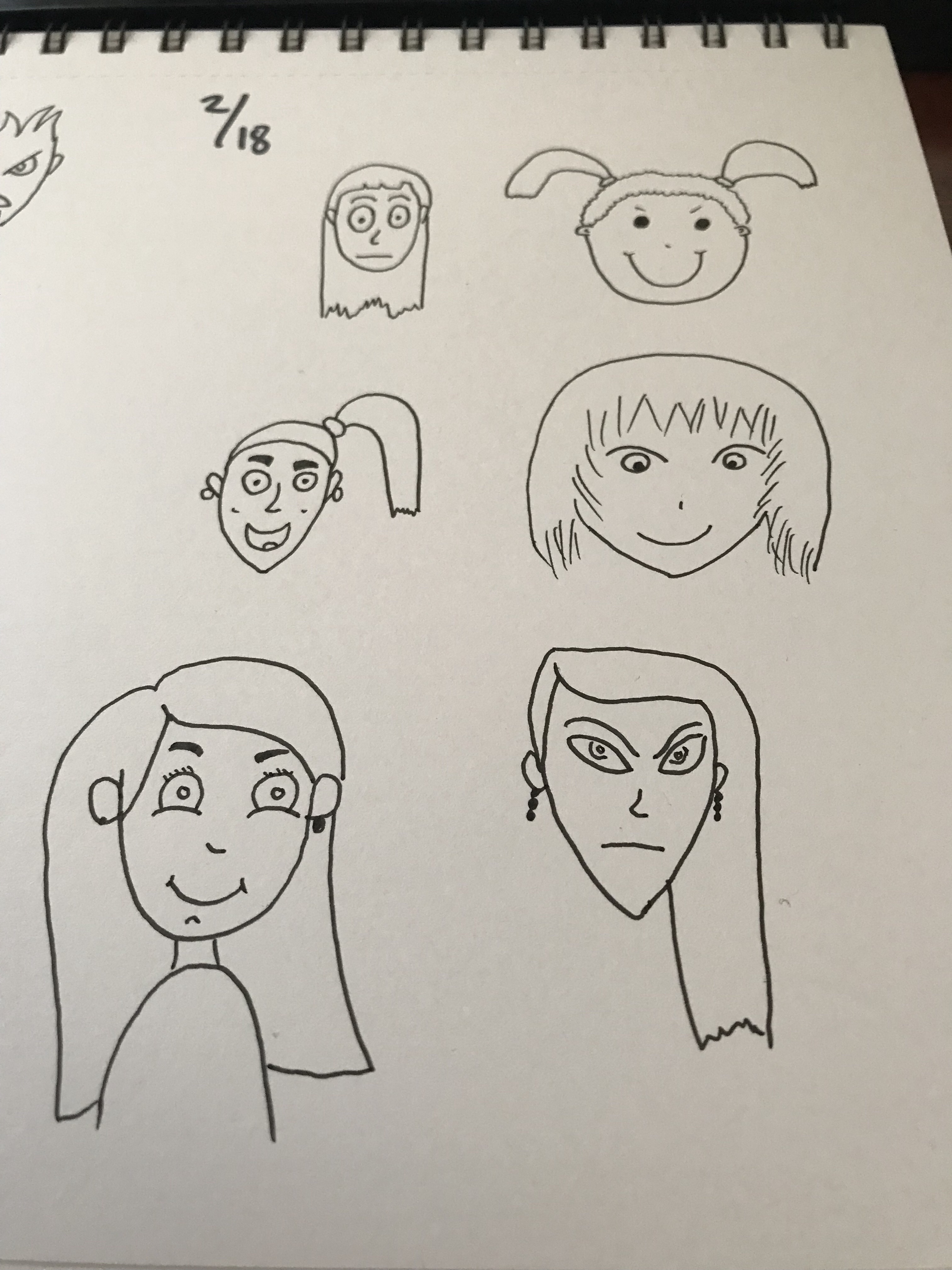 So as goofy and simplistic as they are these actually kind of represent some progress; I’m starting to draw original pictures rather than copying something that’s in front of me, and at the suggestion of drawabox.com I’ve switched to working with pens rather than pencils because they force me to stop and think before making a mark on a piece of paper. Sooner or later I will start doing little cartoon dudes with, like, bodies and shit, but I’m not quite there yet. Just faces for right now.