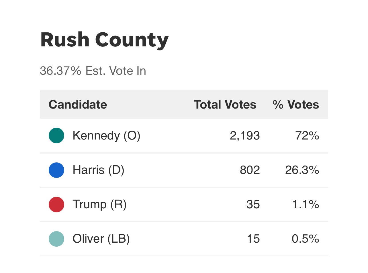 7:00: A whole lot of states are about to close, and meanwhile … this, from Rush County, IN. I don’t actually know where these results are from; they were just posted to BlueSky.