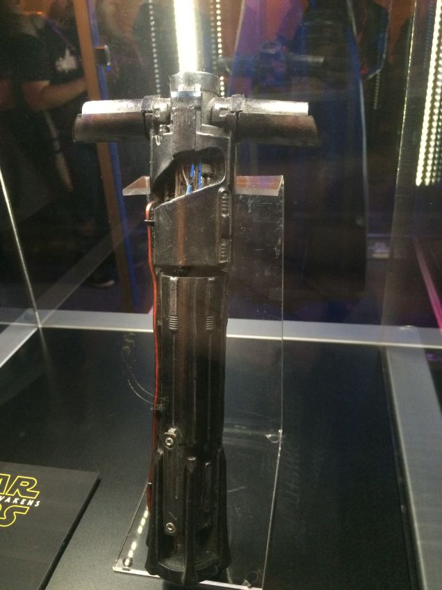 This is the hilt of Kylo Ren’s cross-guarded lightsaber, which caused so much kvetching when the first trailer came out. I was not happy with the new look for the lightsaber blade (not the crossguards, the blade itself) and said that I’d drop my objection if there seemed to be a story-based reason why the blade looked different.