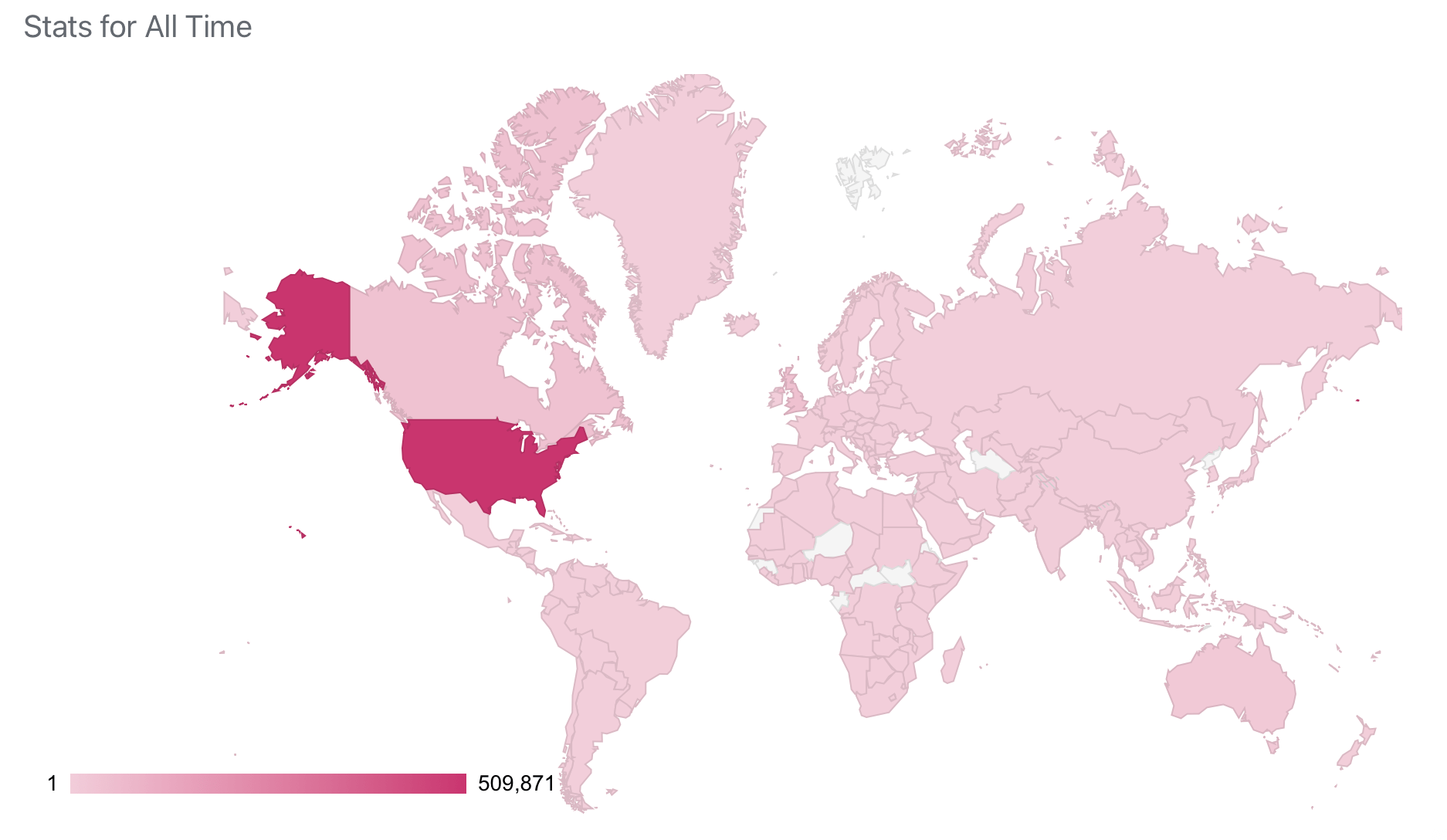 There’s been exactly one pageview from 14 places: the Cook Islands, Equitorial Guinea, the Faroe Islands, French Guiana, Iran, the Marshall Islands, Martinique, San Marino, the Seychelles, Sint Maarten, St. Martin (apparently a different place?), Syria, Tajikistan, and Togo.