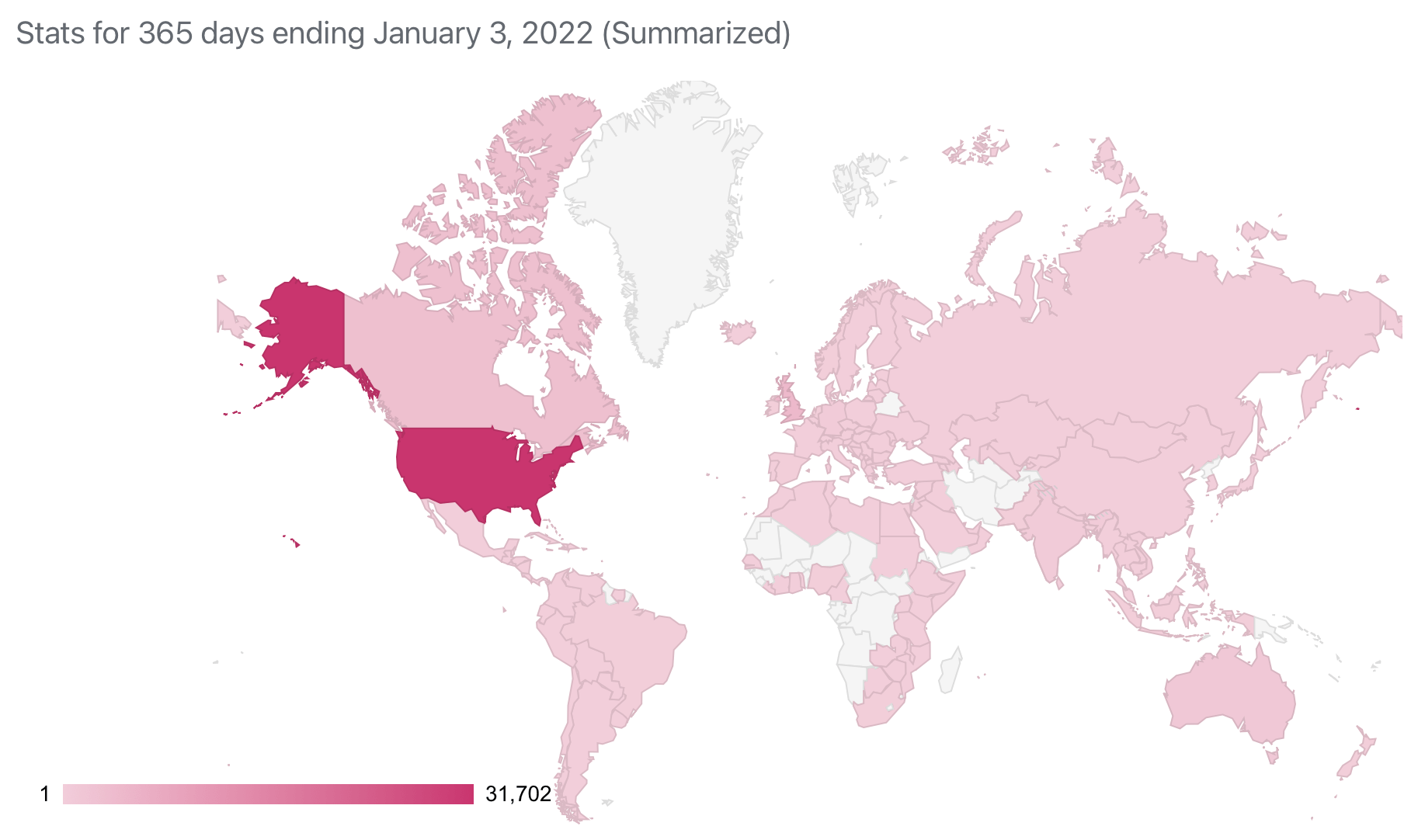 I keep almost writing a 2021 blogwanking post or a sort of round-up of last year, and then finding excuses not to do it. Not that the bathroom renovation isn’t more interesting (I hope, at least) than endless navel-gazing, but I can only put this off for so long before I just can’t write it any more. So, long story short: traffic last year was way way way down, which doesn’t matter because it’s still plenty high for a personal blog site of a non-famous person in 2021, and y’all are stuck with me here anyway for the foreseeable future. Two things are pretty cool. This is the lifetime map of countries that I’ve had hits from: