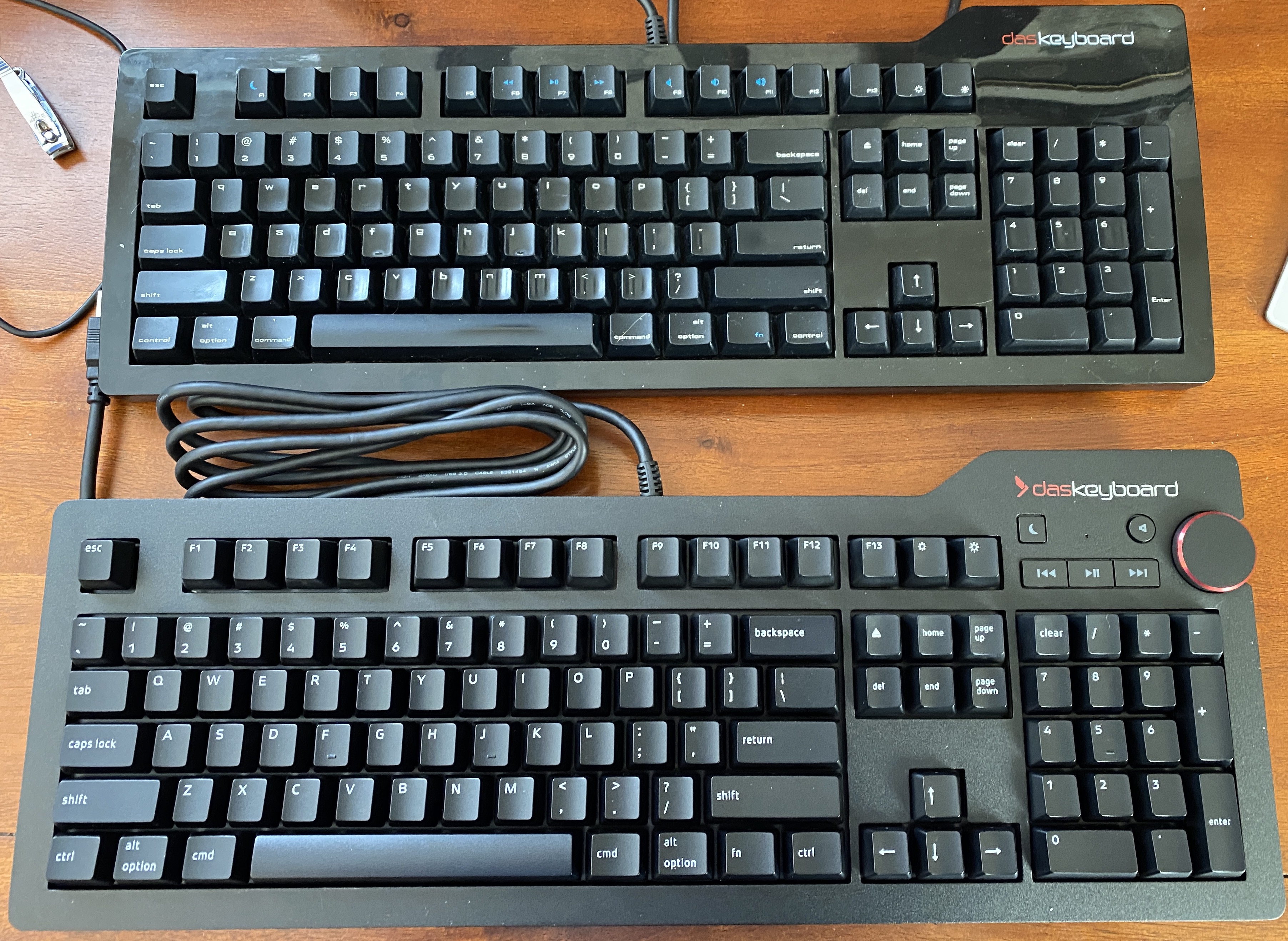 Pictured above: my original,loyal Das Keyboard, which provided me with seven years of service before something underneath the left half of the keyboard cracked while I was trying to fish a piece of debris out of it. Underneath: its replacement, which arrived today and is effectively the 2022 model of the same keyboard, except specific for my Mac and also featuring Cherry MX Brown switches instead of the Blues that were in the original keyboard. While I am a big fan of clicky keyboards, and Blue switches are the clickiest keys currently on the market, the fact that my wife and I are still frequently in the office together when one or both of us is in a meeting means that my preferred kind of keyboard is actually kinda rude compared to the standards of way back when I purchased it.