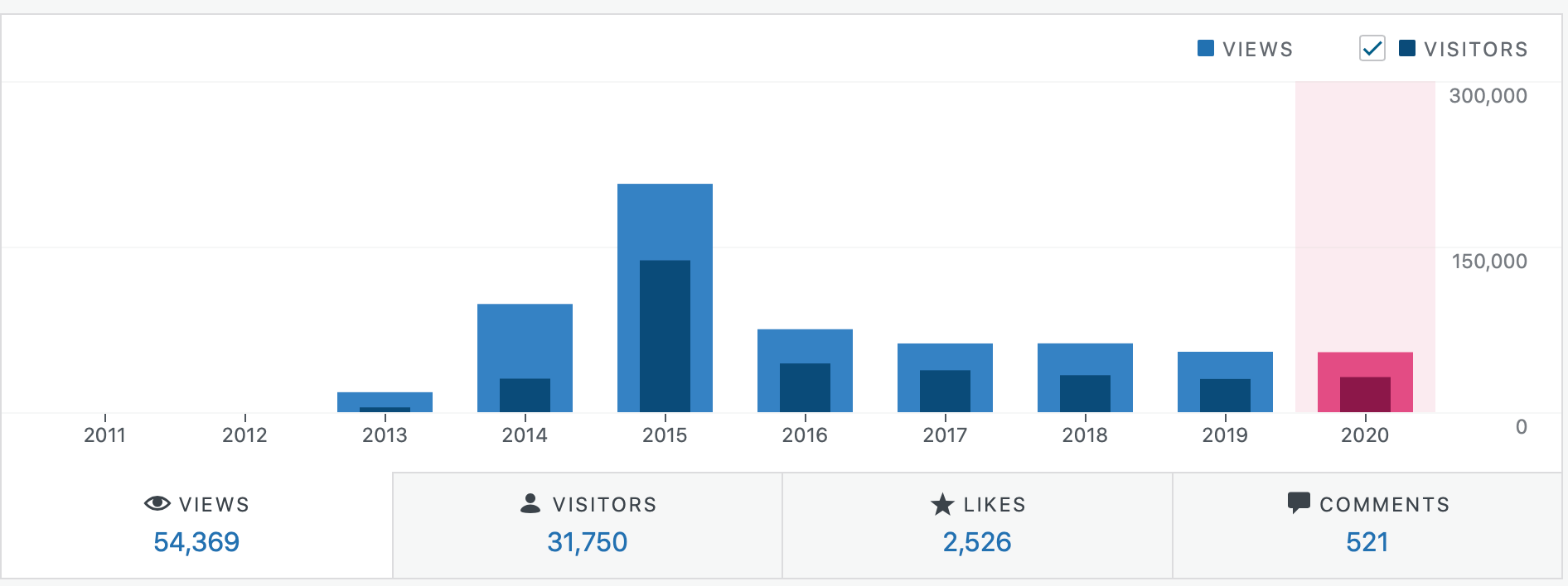 Sometime this weekend– possibly today, although it would require someone or a few someones to go a’wandering through the archives for a while, or looking at cosplay pictures— the site will surpass last year’s traffic. Which would be nice! That big spike in 2015 and a good chunk of 2016’s bar is all from a single post that went nuts, but in general I’ve considered 60K a nice round number to shoot for each year, and while I didn’t get there last year I should get a decent way past that this year unless the site collapses for some reason. I’m already up on visitors from last year, but I still need about 400 more hits to catch it in traffic, and there’s a bit of a way to go for Likes and Comments.