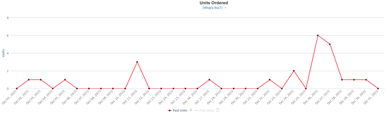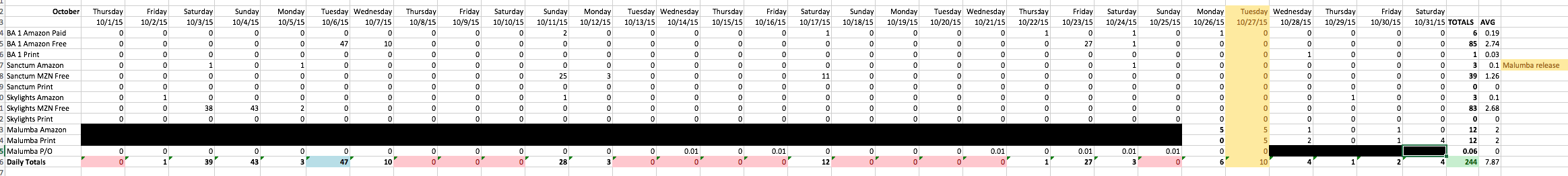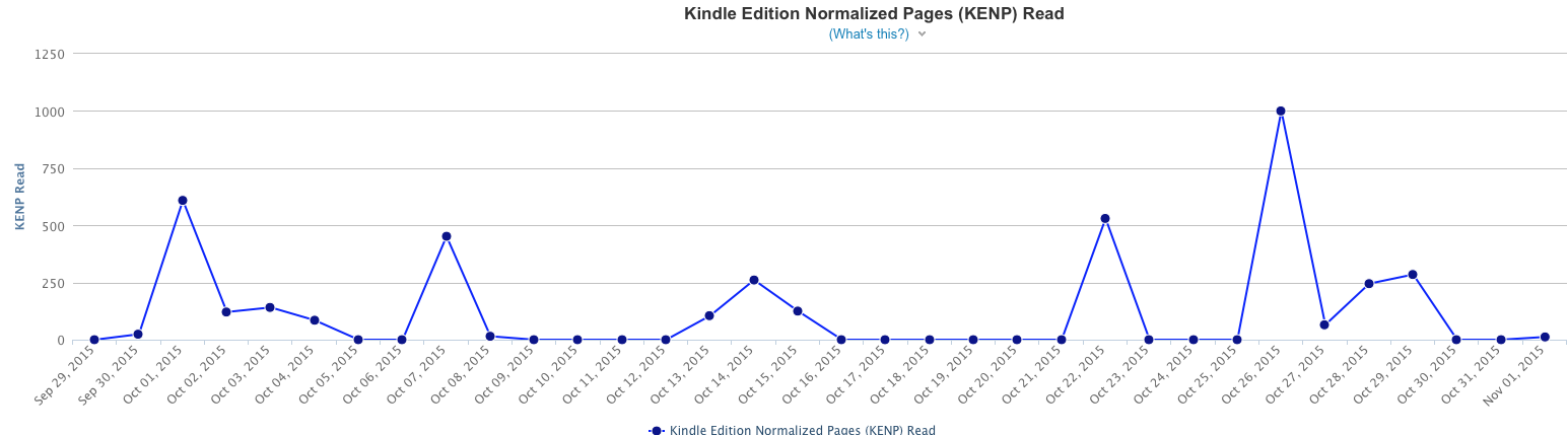 There are 13 pages for BA Vol. 1 in there somewhere, and that little blip at the end is about 80 pages for Malumba.  Every single other KENP read I’ve had is for Skylights.  Now, Skylights, cover-to-cover, is 535 “Kindle Edition Normalized Pages” long, which is what KENP stands for.  Note that that means that on October 26 two different people read the book goddamn near cover-to-cover, or at least a lot of people read smaller chunks of it.