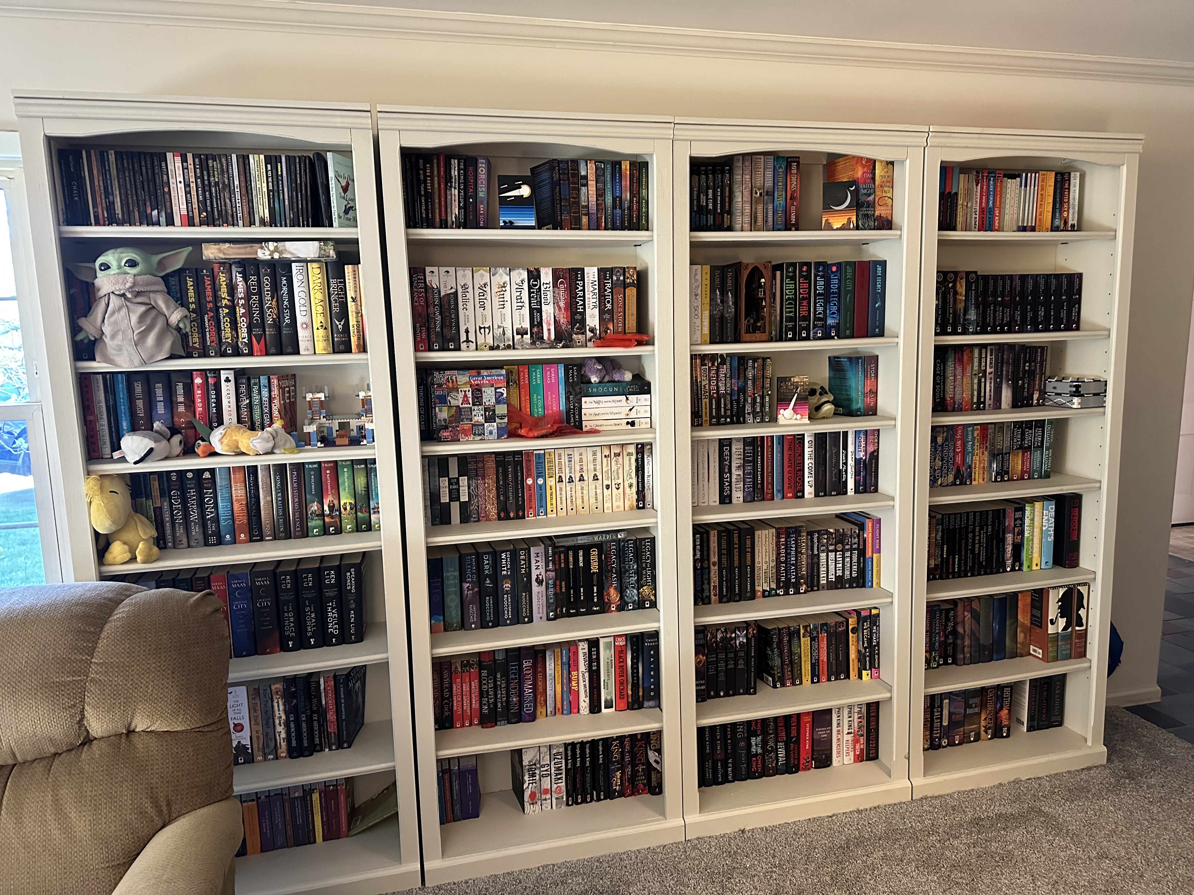 If you’ve been around here for any length of time– five days would do it– you have certainly seen at least a variant of this picture, my four Nice Bookshelves that are in my living room and are currently dedicated at least mostly to series fiction. The bottom shelves are an exception, partially, but whatever.