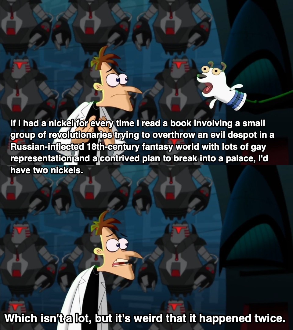 And, like, the main character is the deposed tzar, who is married to the guy who deposed him, and he and his court are in hiding for most of the book. He’s very mopey about it. You’ve seen Monty Python’s Holy Grail, right? Remember the bit with the prince in the castle who just wanted to sing? Imagine that guy was the tzar of Russia, only instead of singing, he wanted to have sex with his husband. That’s the vibe for a lot of the book. He snaps out of it eventually, but he’s very sad for basically the whole first half. Also drunk. And the interactions between the main group of characters really don’t feel like an exiled potentate and his court. They’re more like a bunch of grad students in a polycule. At one point they go to a magic library– the magic library is probably my favorite part of the book and I would gleefully read an entire book about Aleksandr, the librarian, and his disembodied head coffee table, and no, I’m not explaining that. But they go to the magic library and they’re sitting in a room listening to the librarian talk and one character sits on another one’s lap. There’s a bit where they’re expositing at each other early in the book and three of them are basically lying in a cuddlelump on the floor.