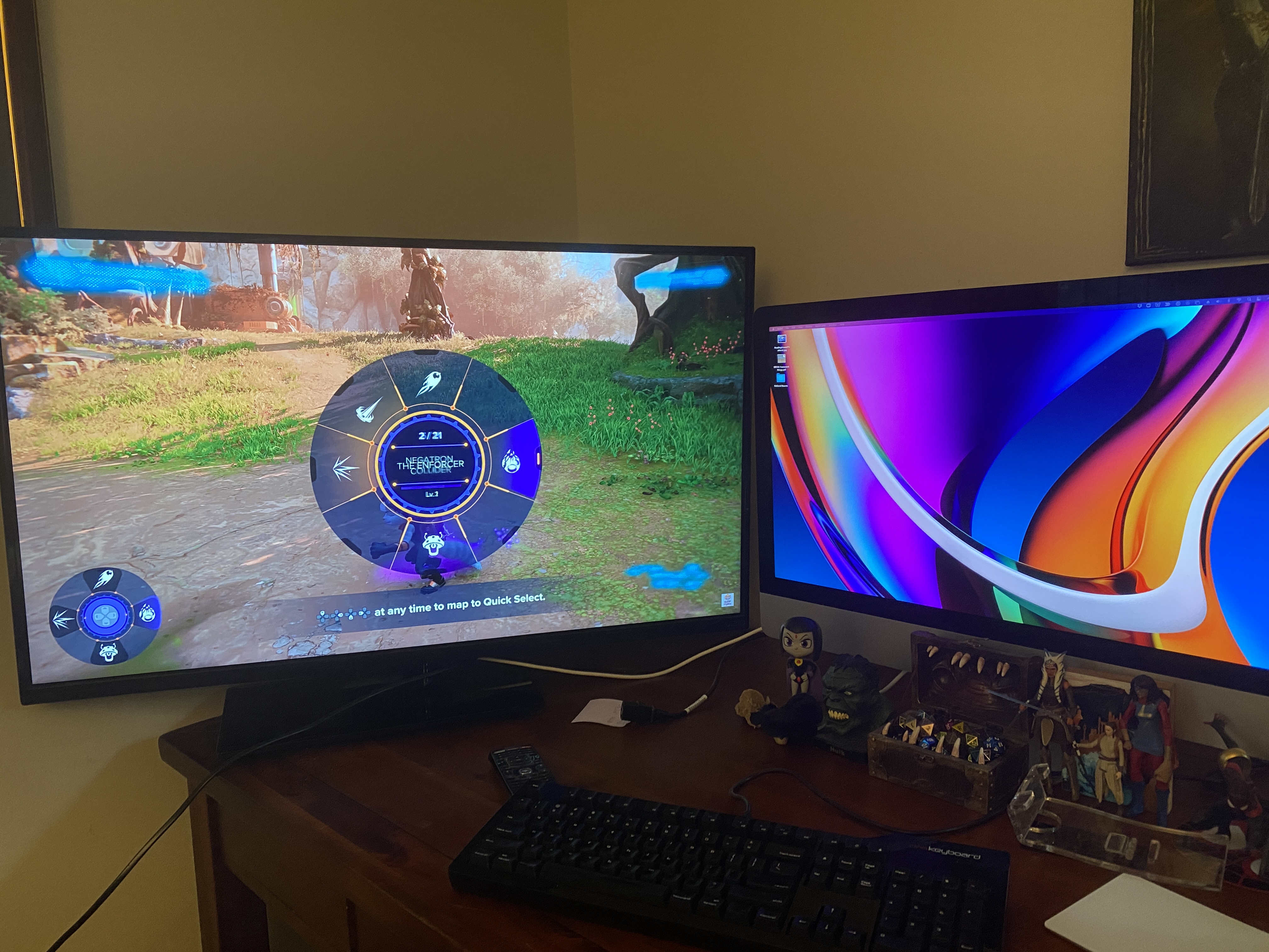 This setup, which I have no intention of making permanent, is what happens when I realize I have a 43″ TV in my bedroom that is not ever used– has been sitting there not even plugged in for months, in fact– and decide to see what happens when I try and use it as a secondary monitor. I have been tossing around the idea of moving the PS5 into the office so that I’m not monopolizing the TV that’s in there with my nonsense, and this won’t be the TV I use if I actually do that, but it got me wondering. My iMac is a 27″ 5K monitor, and the previous secondary monitor was mostly used for TweetDeck or for keeping videos running on while I did other stuff on the primary monitor. If I use this one, the resolution isn’t as good as the primary but the size overwhelms it, so … I don’t even know what the hell I’m doing right now.