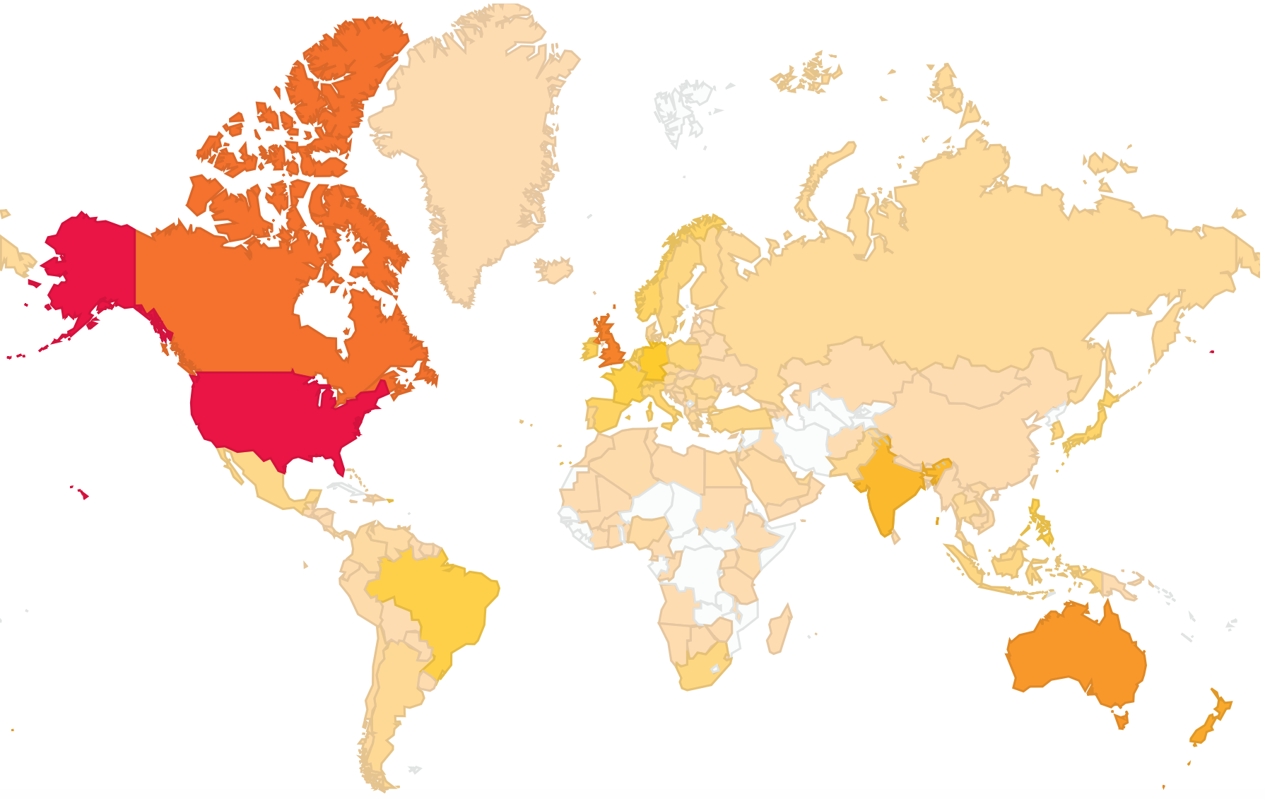 Africa:  Currently a mess, which is unsurprising.  Hard to say which country will be last; I’d have thought Ethiopia but I’ve already gotten half-a-dozen hits from there.  Somalia, maybe?  South Sudan?  Who knows.