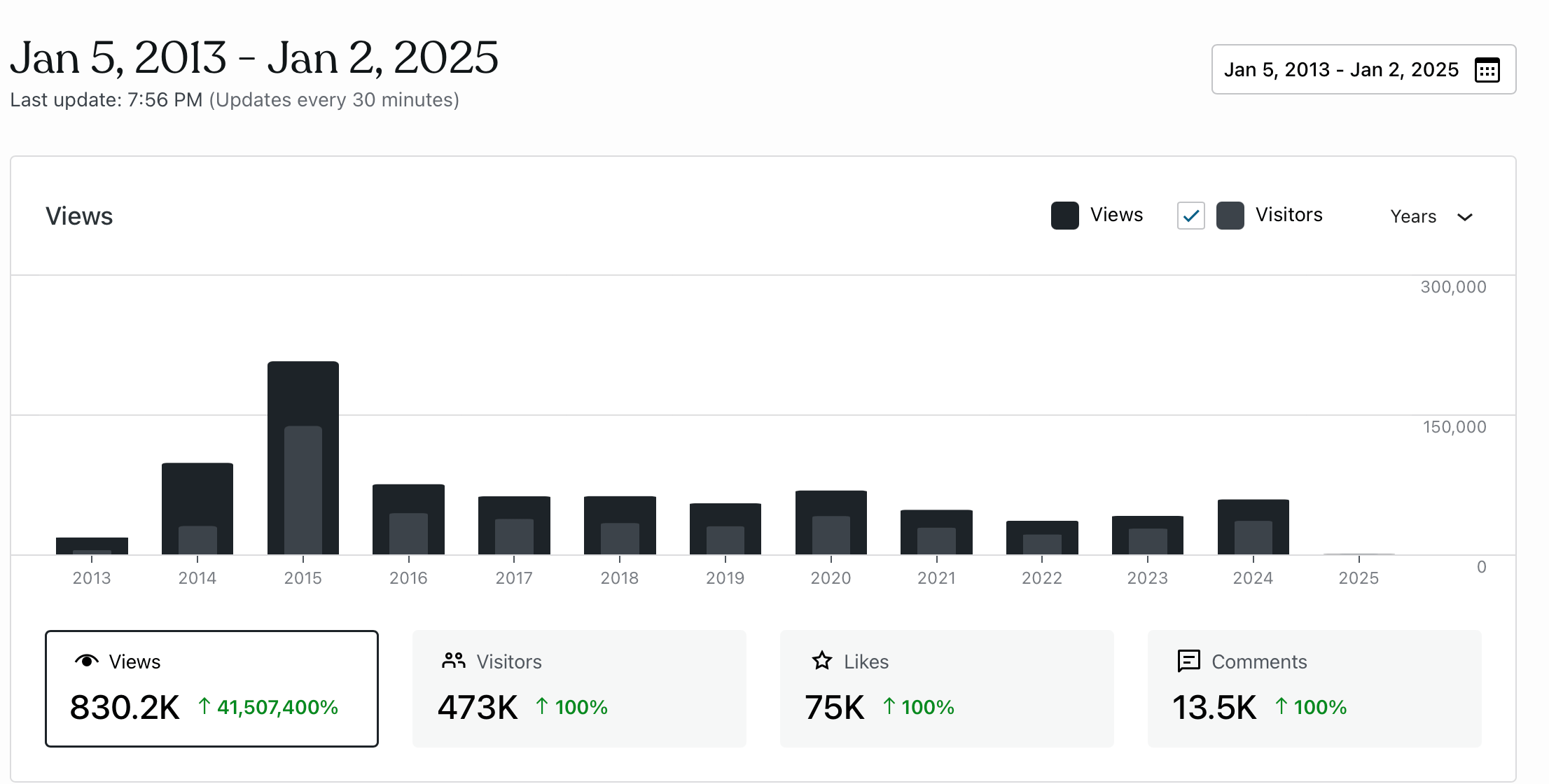 The 7200 from the US would nearly be the best month of the year all by itself. October 2025 was the best month in years, and November should pass it tomorrow. It looks like my traditionally big posts are getting the lion’s share of this traffic, but the numbers aren’t adding up, which is weird, and I feel like this also pushes back on the bot theory– would thousands and thousands of bots be indexing the same post over and over again?